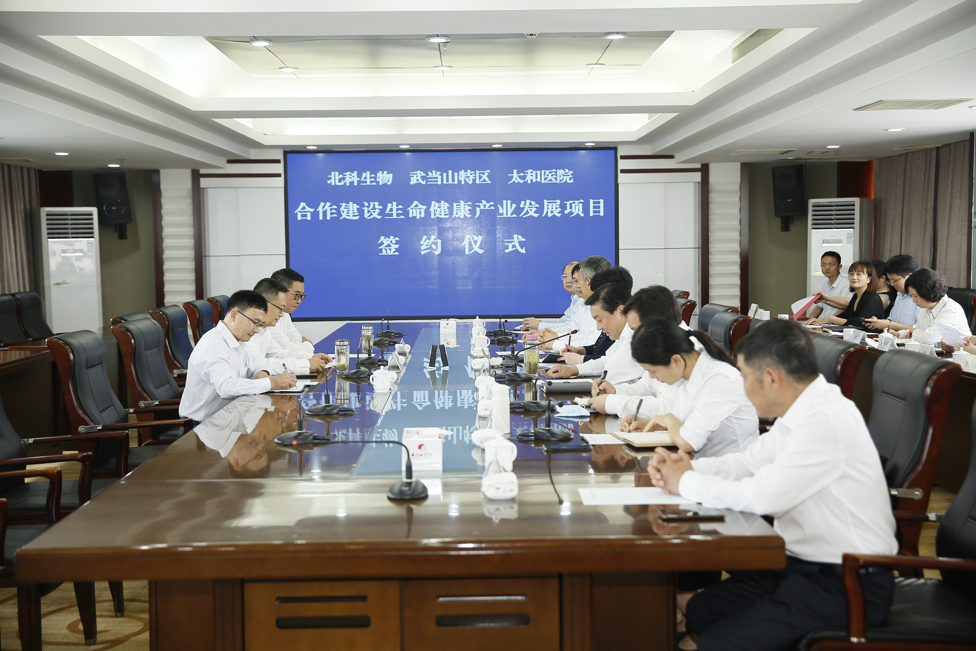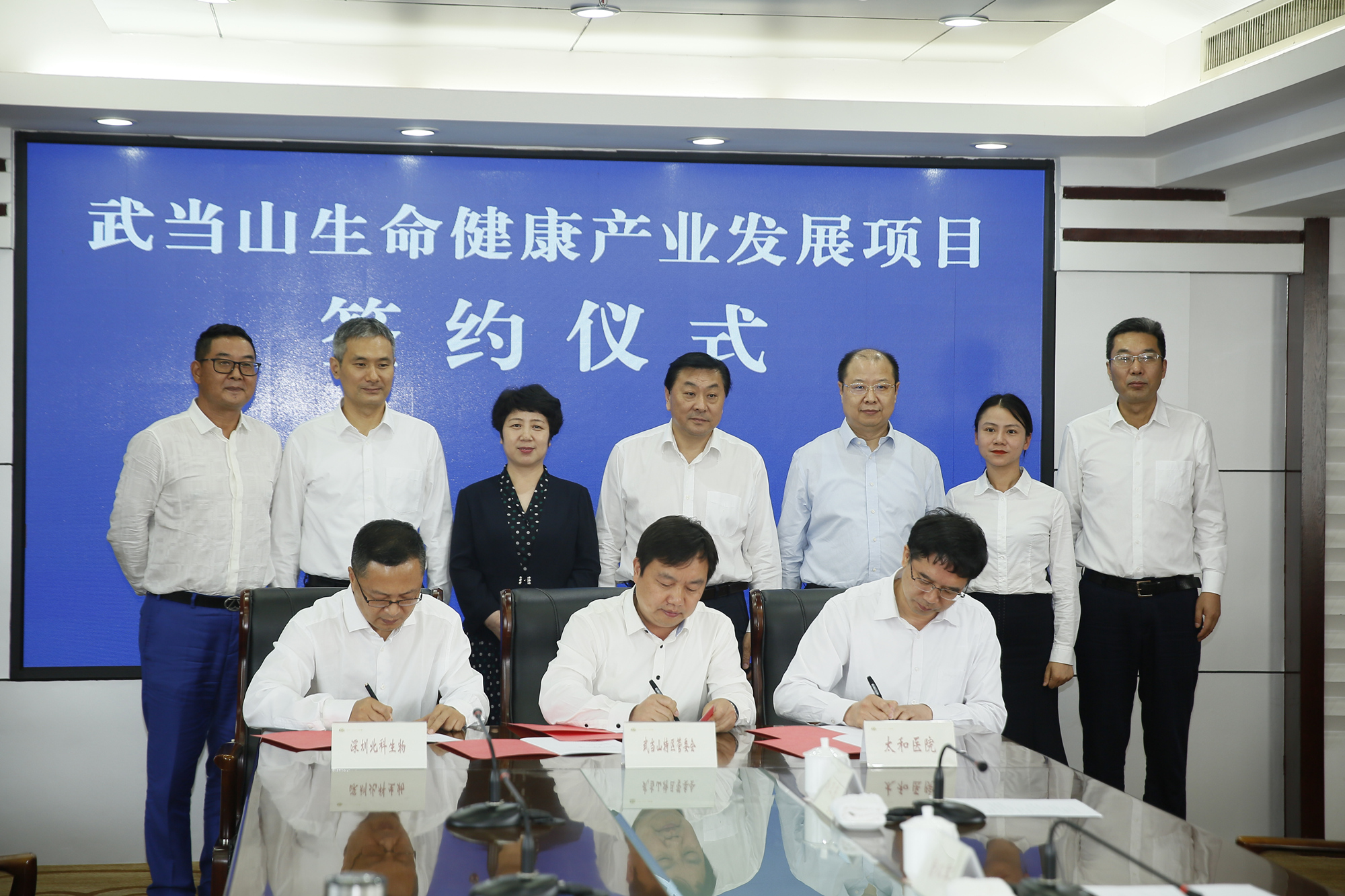 6月10日,武當(dāng)山生命健康產(chǎn)業(yè)發(fā)展項(xiàng)目簽約儀式在十堰武當(dāng)山賓館舉行。十堰市副市長劉運(yùn)梅,深圳北科生物科技有限公司董事長胡雋源、高級副總裁劉向陽等出席簽約儀式。十堰武當(dāng)山特區(qū)工委書記、管委會主任沈明云主持簽約儀式。工委副書記、管委會副主任梅華,工委委員、管委會副主任雷震,太和醫(yī)院黨委書記羅杰等參加儀式。